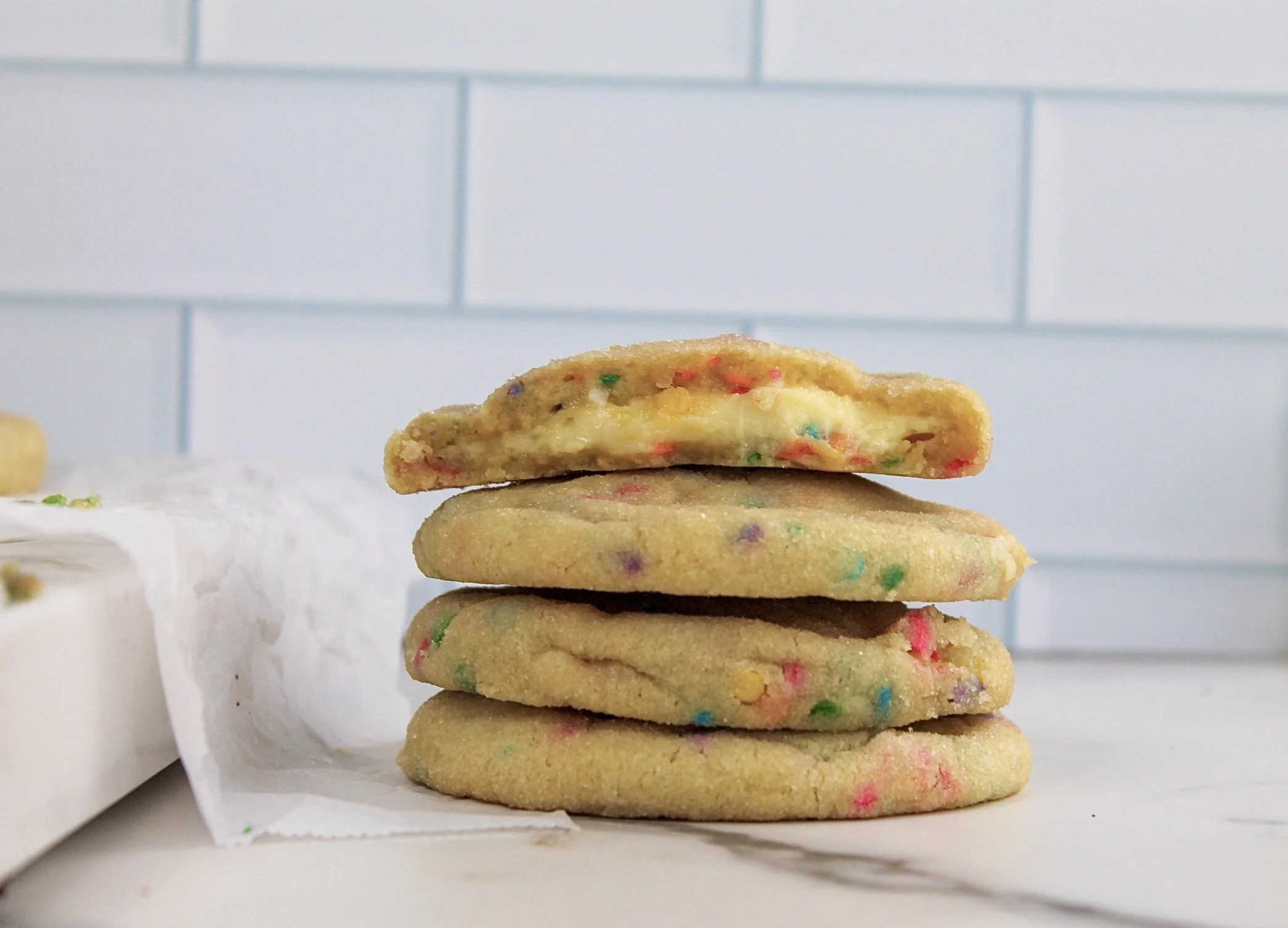 Scoop 1/3 cup of cookie dough, flatten out in palm, and add chilled cream cheese ball in the center. Fold cookie dough around the cream cheese ball and then roll in granulated sugar.