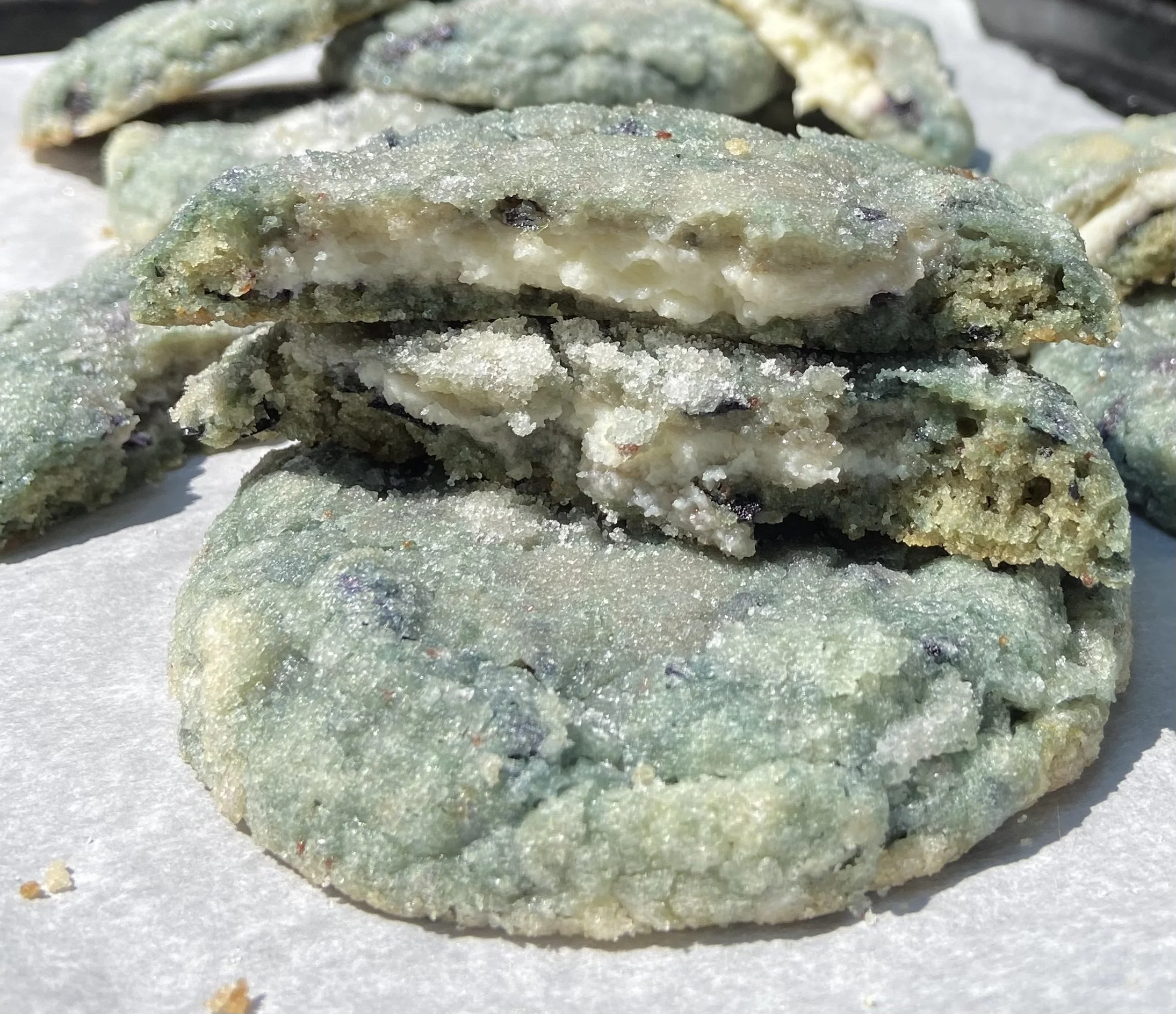 To fill cookies without it oozing out is simple—thick cookie, thick filling. There is no other way around it, honestly. If you have a thinner filling, it is necessary to freeze or completely chill your filling. The cream cheese in this recipe is thick but it is still necessary to chill your filling completely before stuffing your cookies.