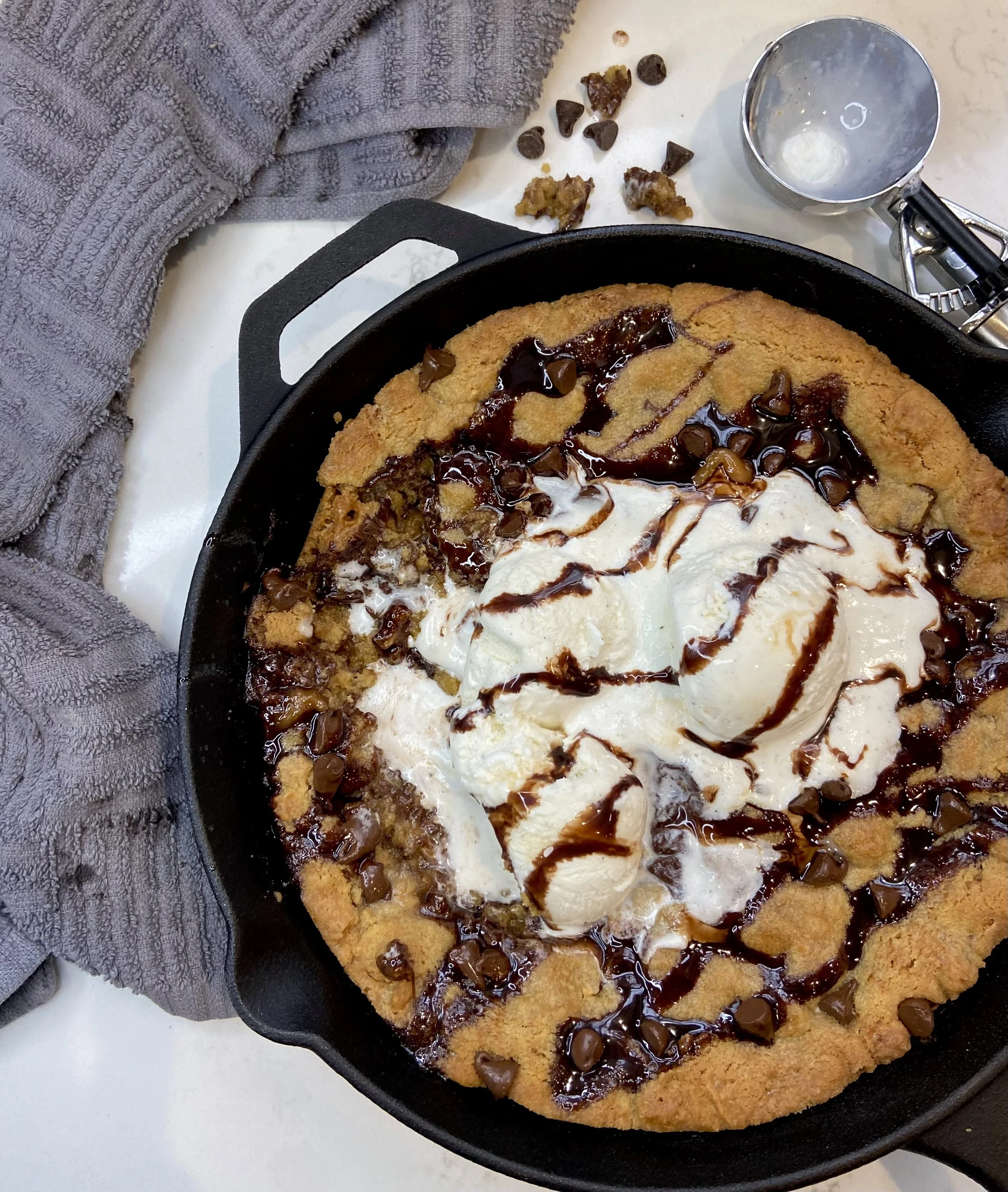 If you are serving this fresh, once it is out of the oven, add your preferred toppings (I like to use ice cream, chocolate syrup, and caramel syrup)!