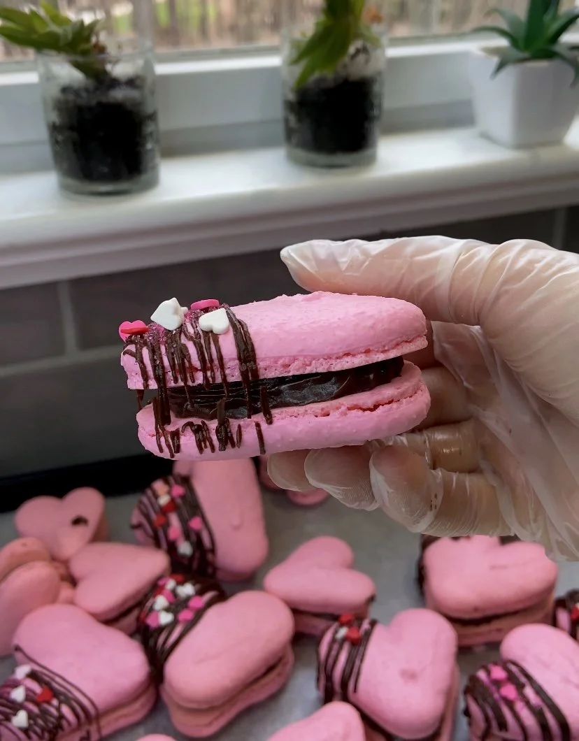 To ensure that all your cookies are the same size, use a macaron silicon mat or use the counting method (count “1…2…3” when you pipe each shell to hopefully make all of them have the same amount of batter). I made mine heart shaped but you can also make them circular!