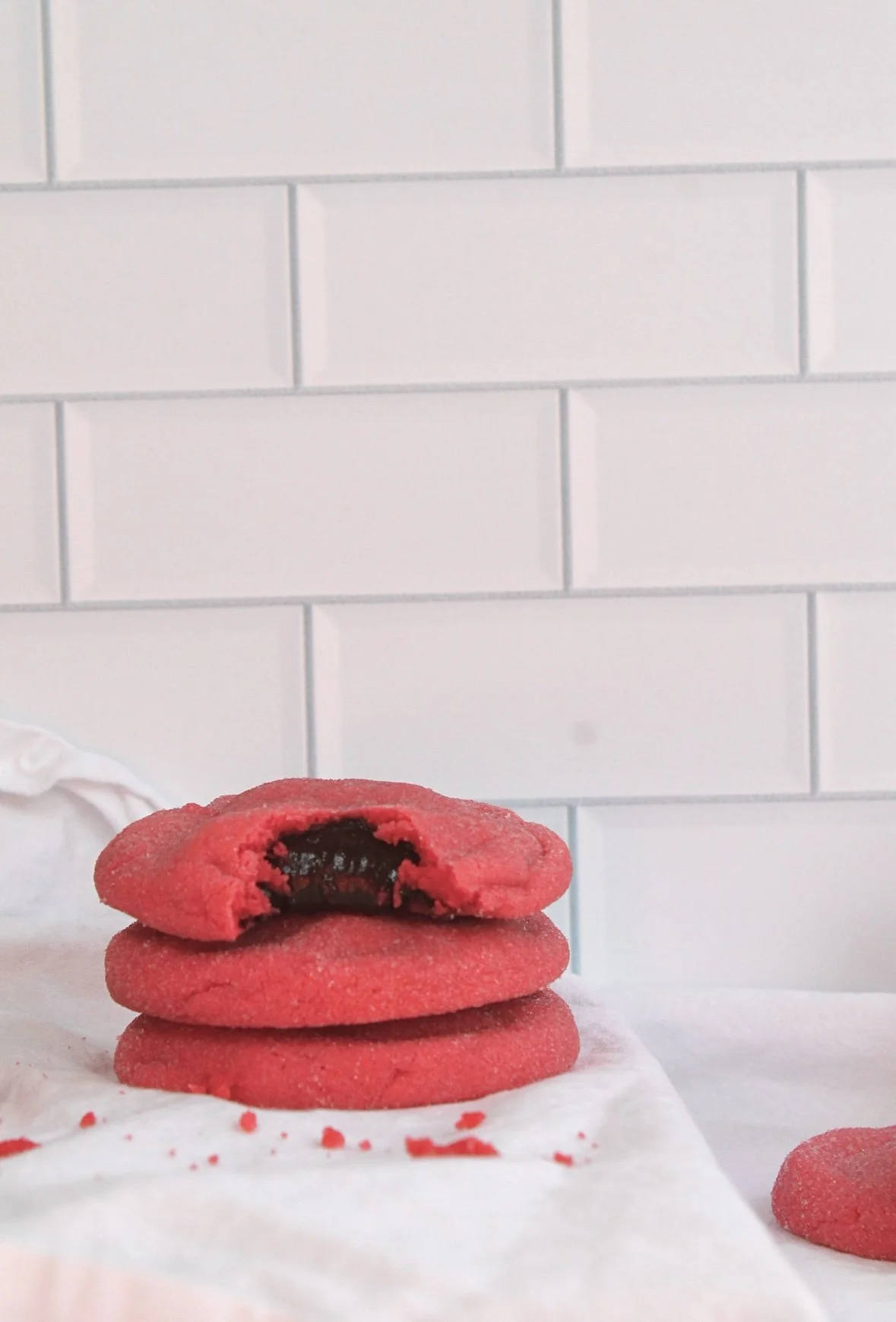 Scoop 1/3 cup of cookie dough, flatten out in palm, and add chilled chocolate ball in the center. Fold cookie dough around the chocolate ball and then roll in granulated sugar.