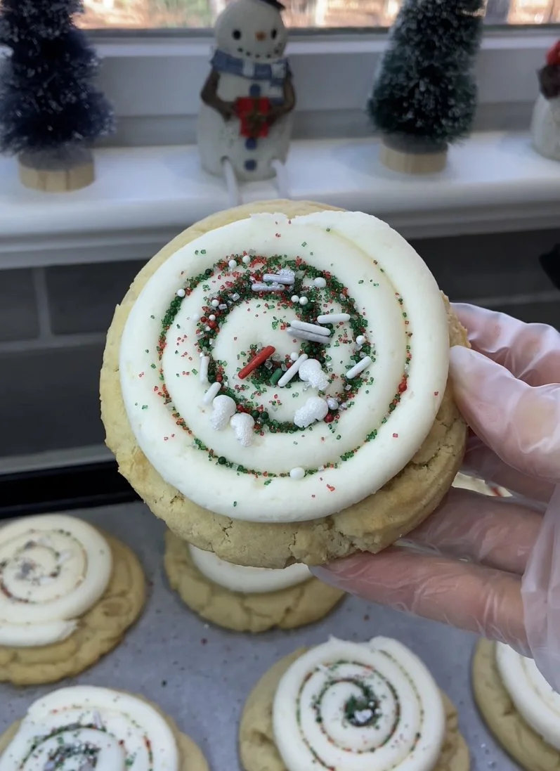 I will always recommend using buttercream frosting because it always has a perfect consistency and is the most simple to make (if you follow the recipe and instructions correctly). However, the texture and consistency of your buttercream frosting depends on your environment. Your frosting will not hold a design very well in warmer environments. It is necessary to keep desserts with buttercream frosting chilled while you are storing them to avoid the frosting melted off of your dessert or becoming too soft—losing the design. You will lose your frosting swirl on top of your cookie if you leave it in heat for too long.