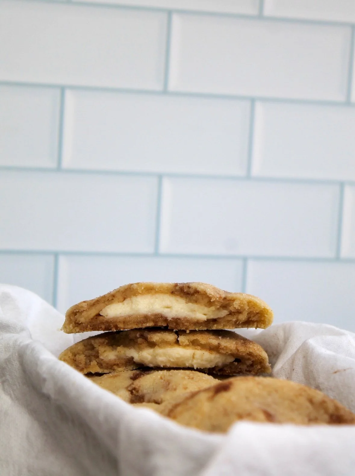 Scoop 1/3 cup of cookie dough and slightly fold in about 2 tsp of brown sugar mixture before flattening out in your palm and add a chilled cream cheese ball in the center. Fold cookie dough around the cream cheese ball and then roll in granulated sugar. Repeat for each cookie.