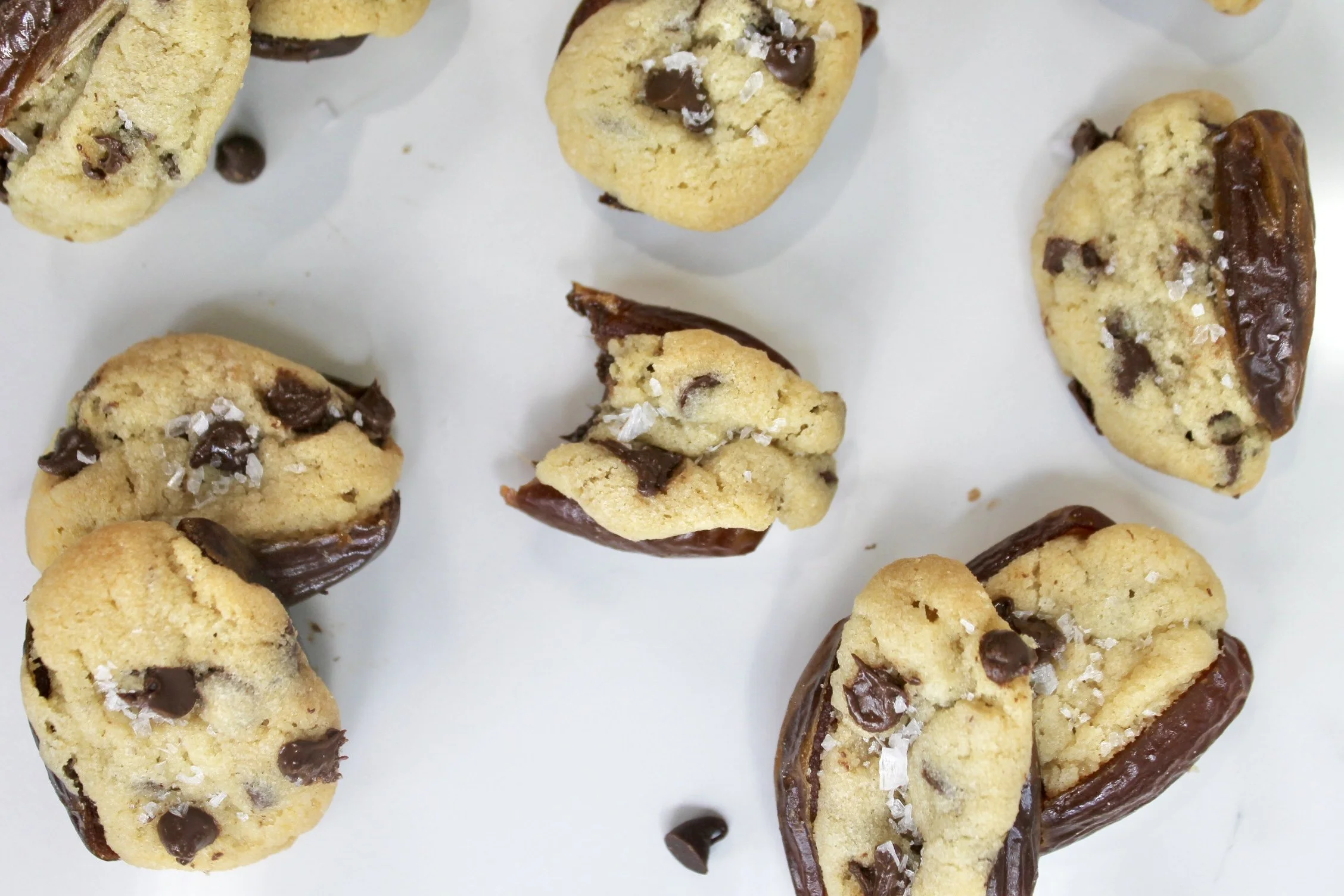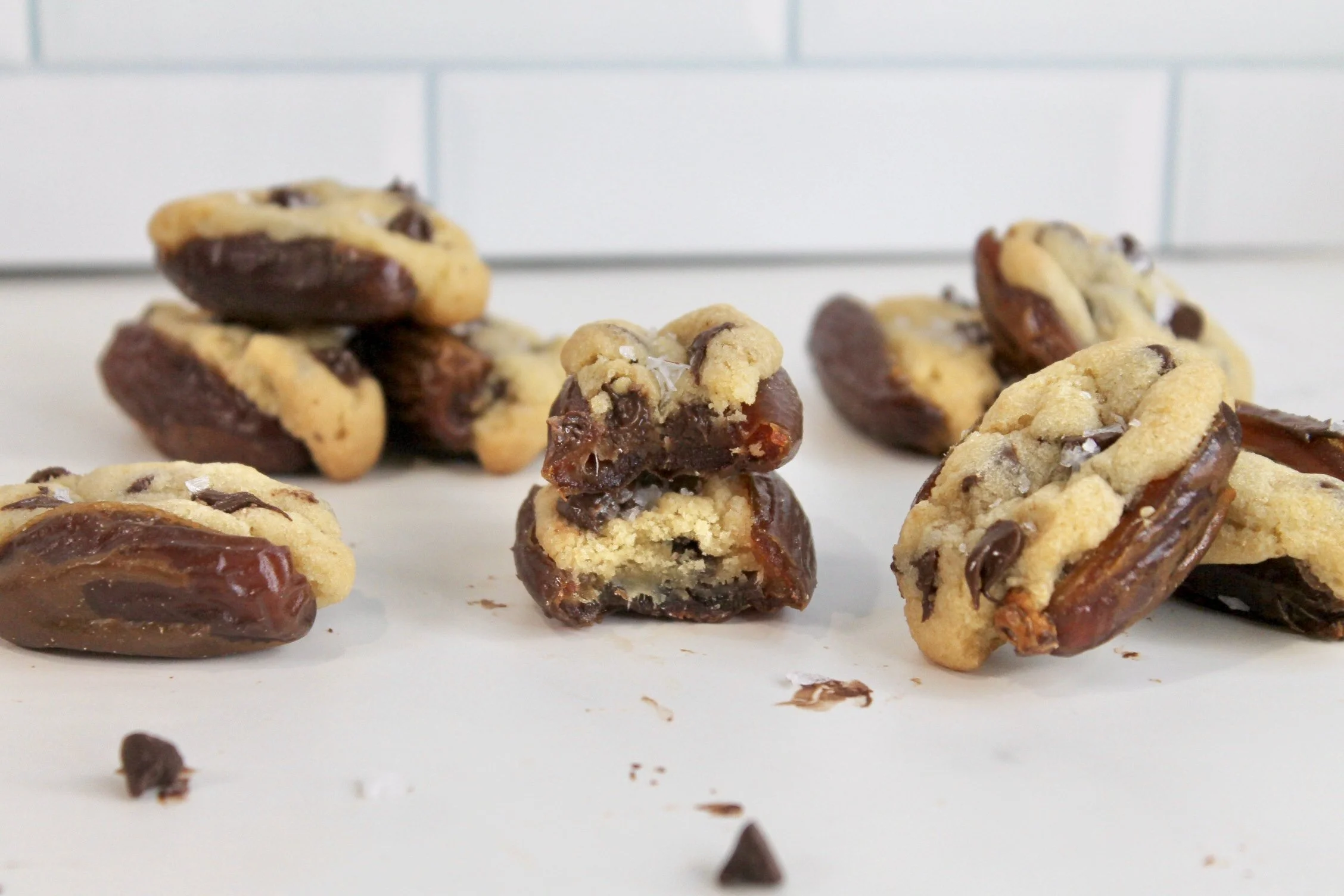 Scoop 1 tsp scoops of cookie dough and place on a parchment paper lined tray. Split open a date and place cookie dough in the center.