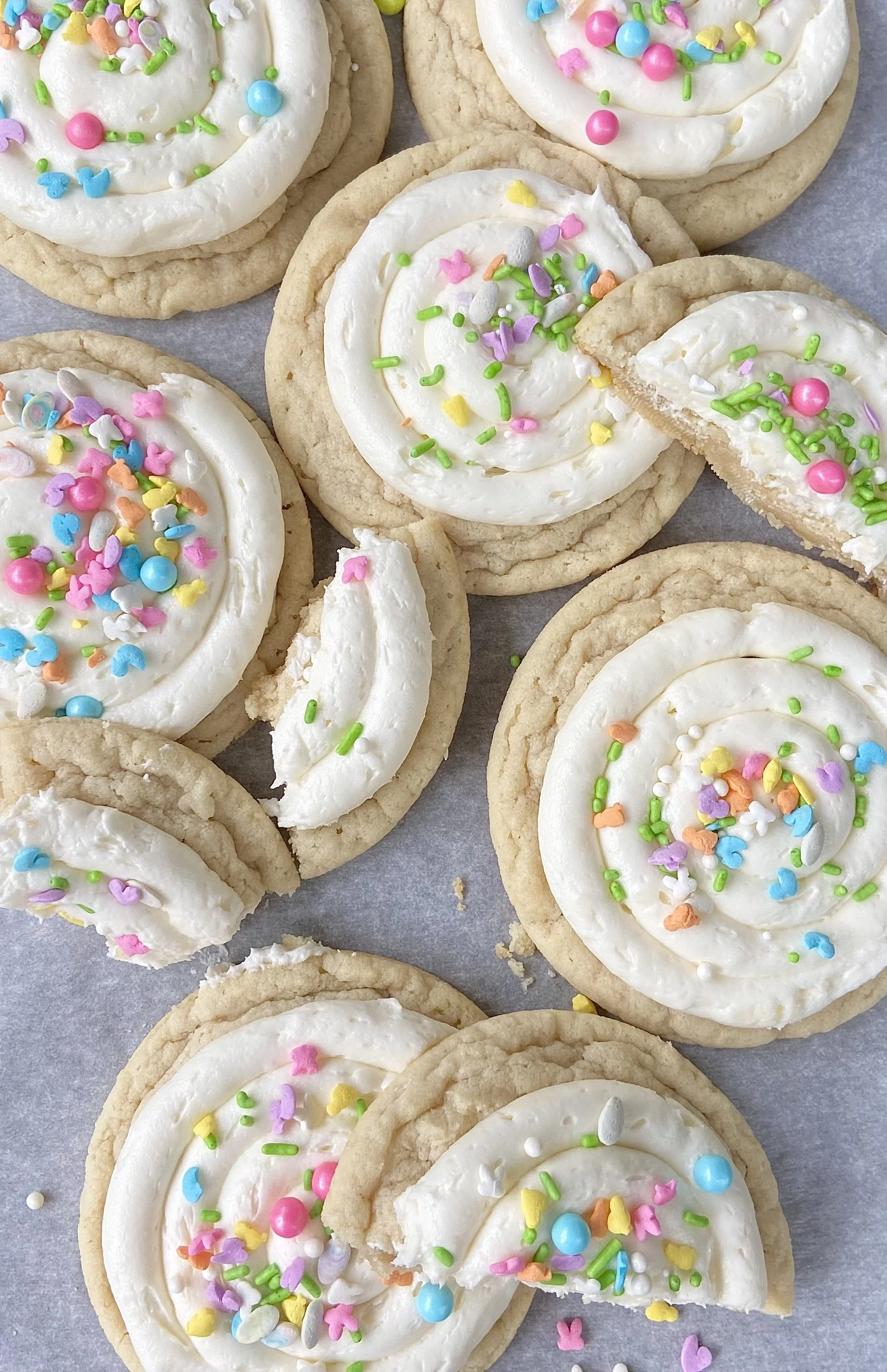 I will always recommend using buttercream frosting because it always has a perfect consistency and is the most simple to make (if you follow the recipe and instructions correctly). However, the texture and consistency of your buttercream frosting depends on your environment. Your frosting will not hold a design very well in warmer environments. It is necessary to keep desserts with buttercream frosting chilled while you are storing them to avoid the frosting melted off of your dessert or becoming too soft—losing the design. You will lose your frosting swirl on top of your cookie if you leave it in heat for too long.