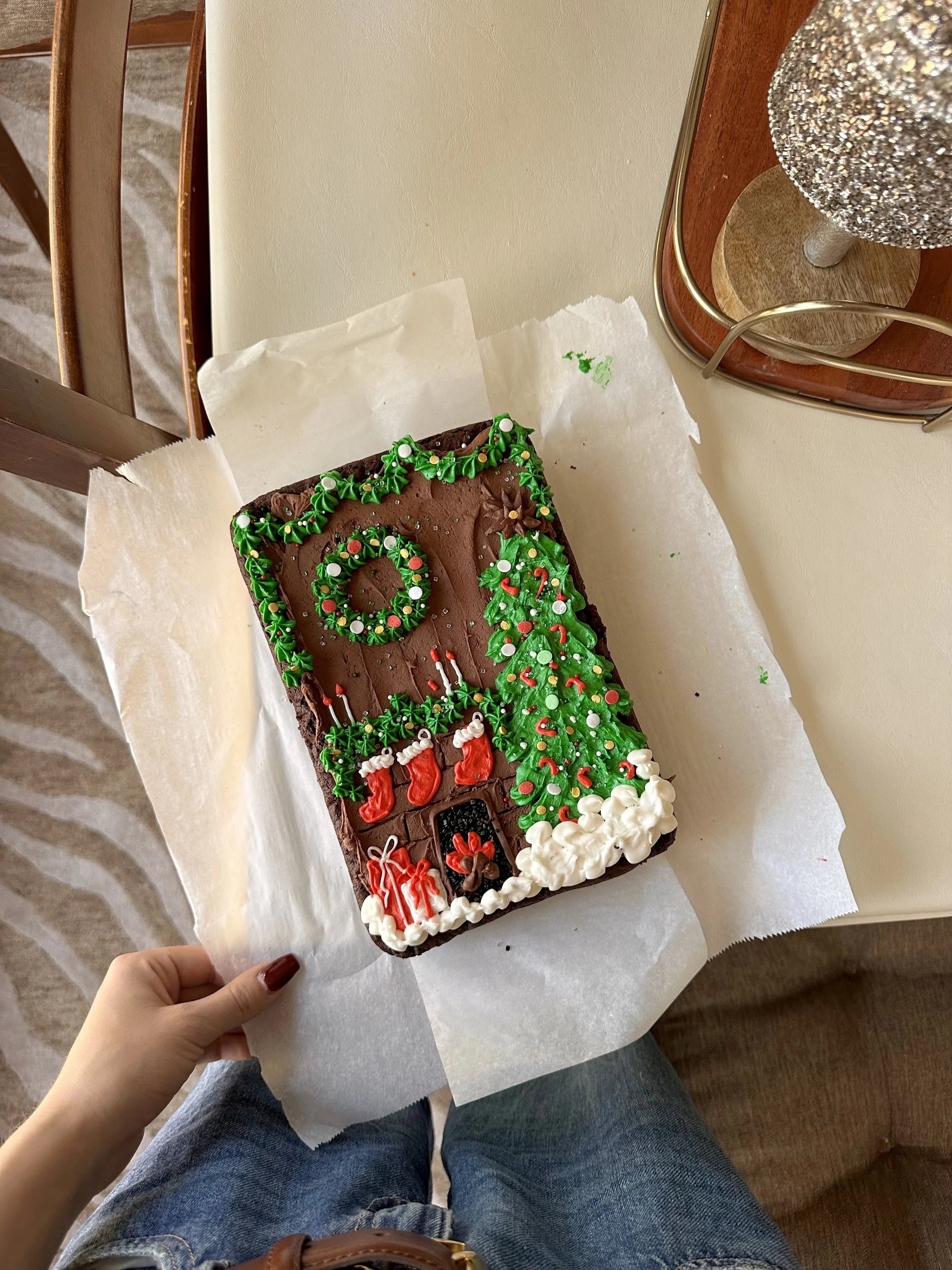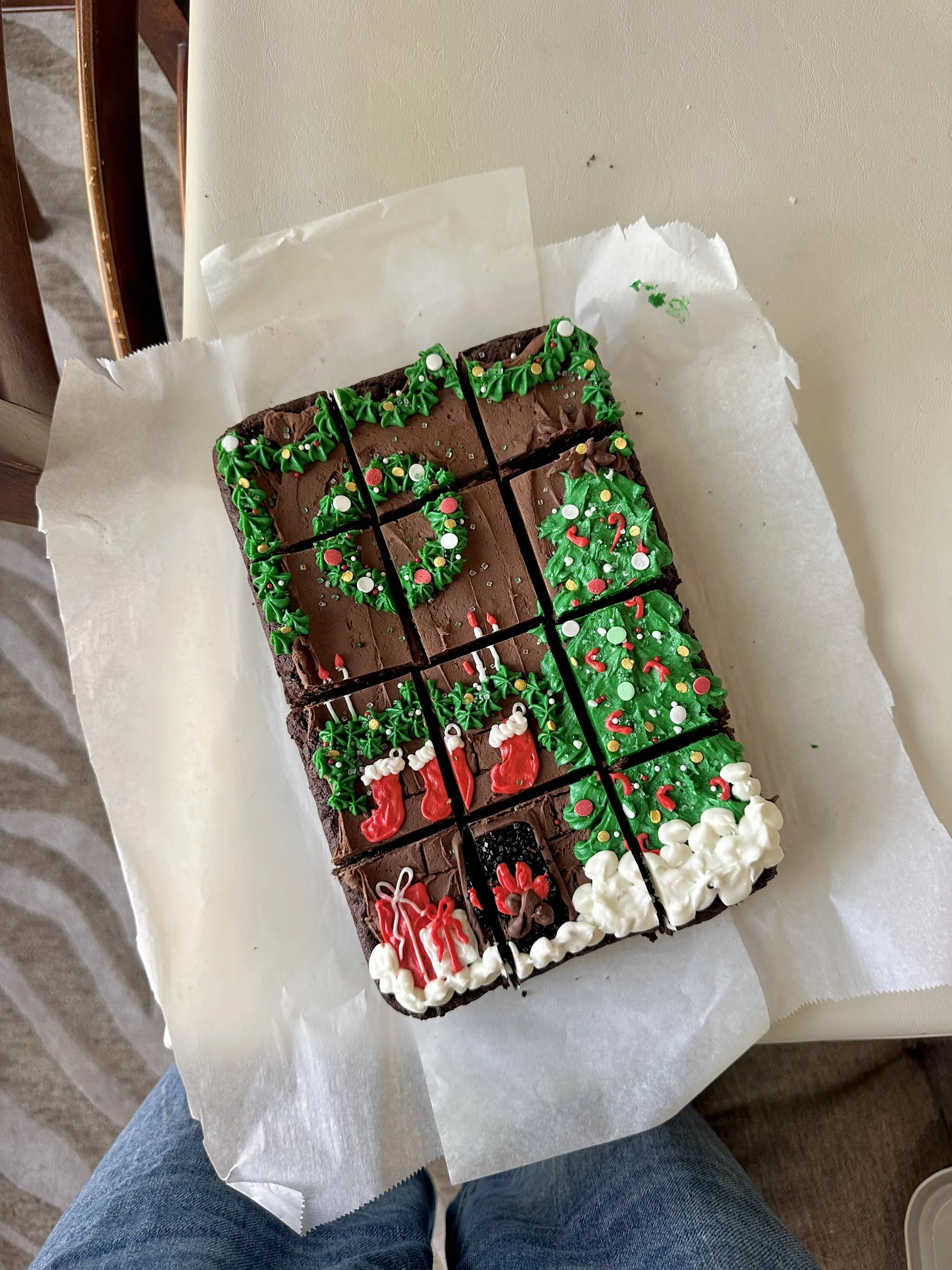 Frost brownies (we used some extra buttercream frosting to make a Christmas design!) and chill for 20-30 minutes.