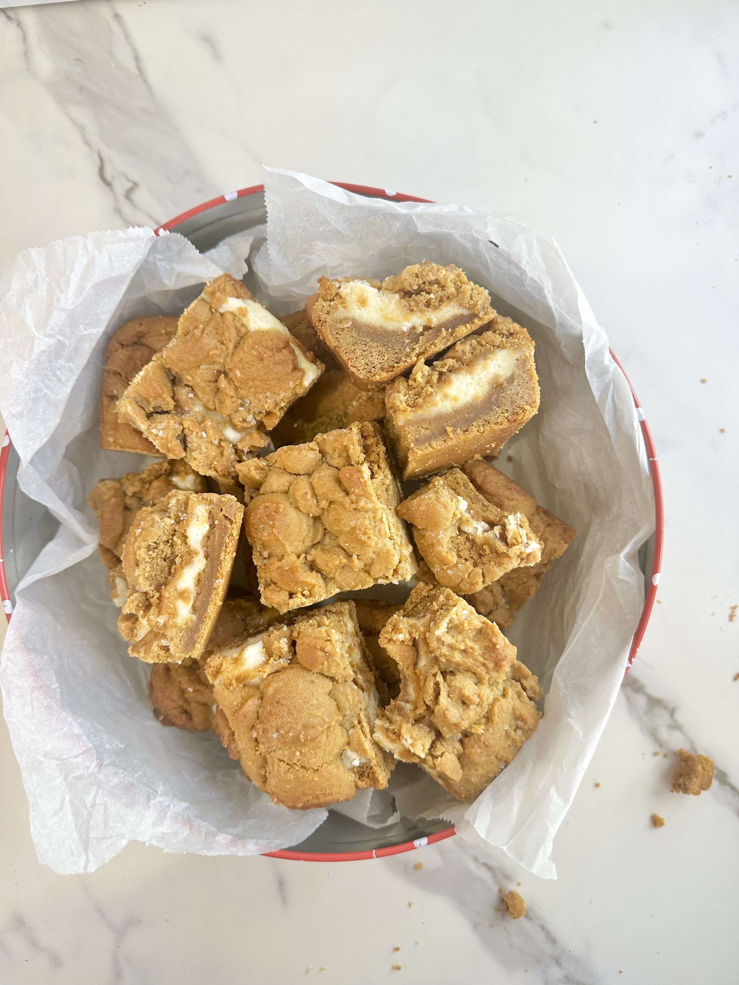 Flatten out half of your cookie dough into an 8x8 parchment paper-lined tray and then spread cream cheese mixture over top. Crumble the rest of cookie dough over cream cheese layer and lastly sprinkle some extra sugar on top (for extra texture!).