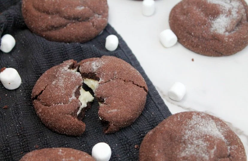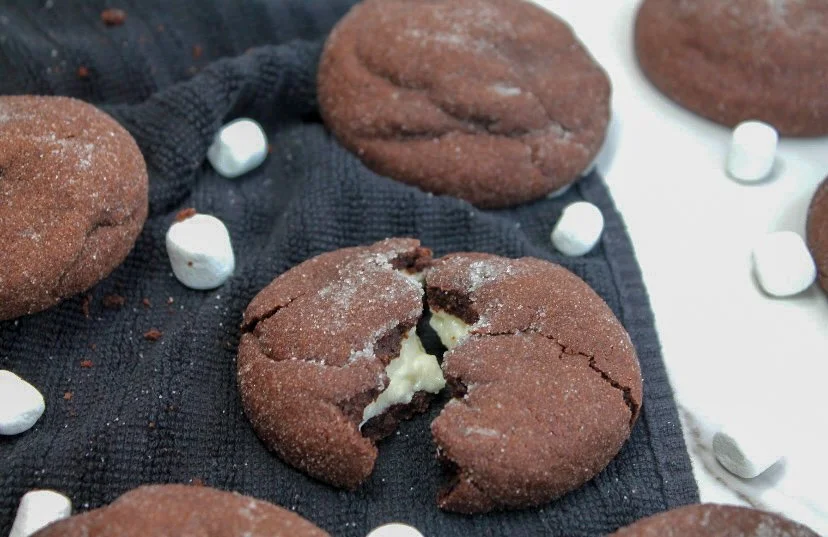 Scoop 1/3 cup of cookie dough, flatten out in palm, and add chilled cream cheese ball in the center. Fold cookie dough around the cream cheese ball and then roll in granulated sugar.