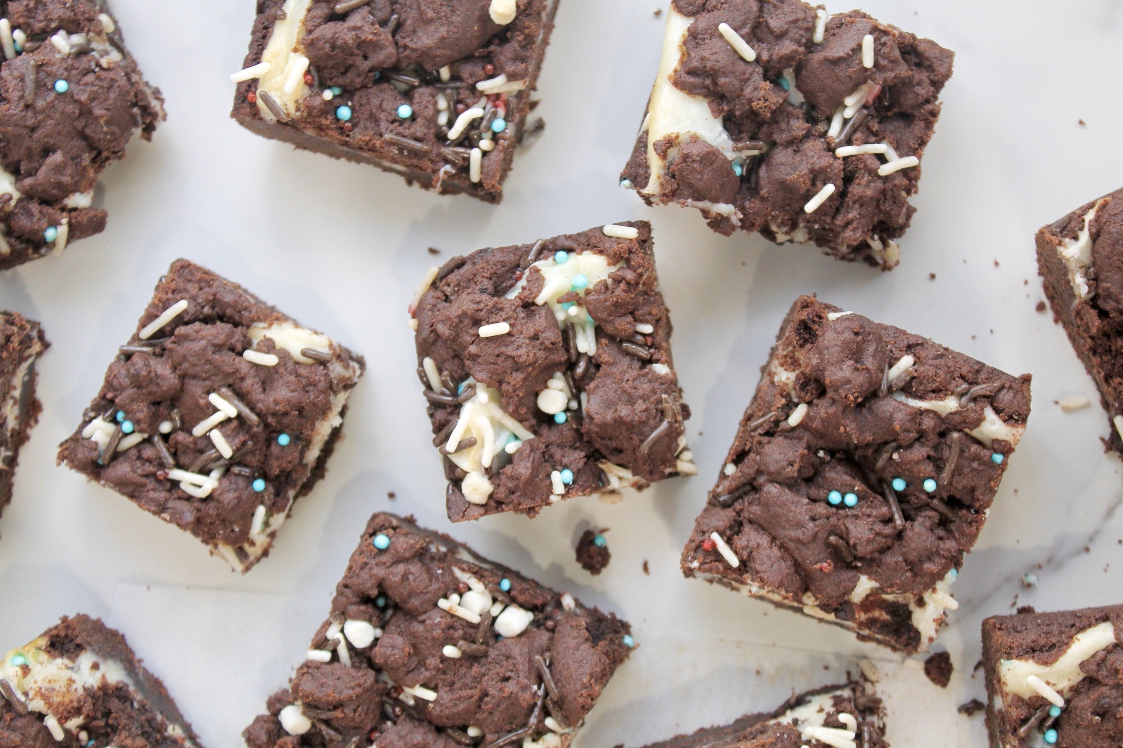 Flatten out half of your cookie dough into an 8x8 parchment paper-lined tray and then spread cream cheese mixture over top. Crumble the rest of cookie dough over cream cheese layer and lastly sprinkle some extra sugar on top (for extra texture!).