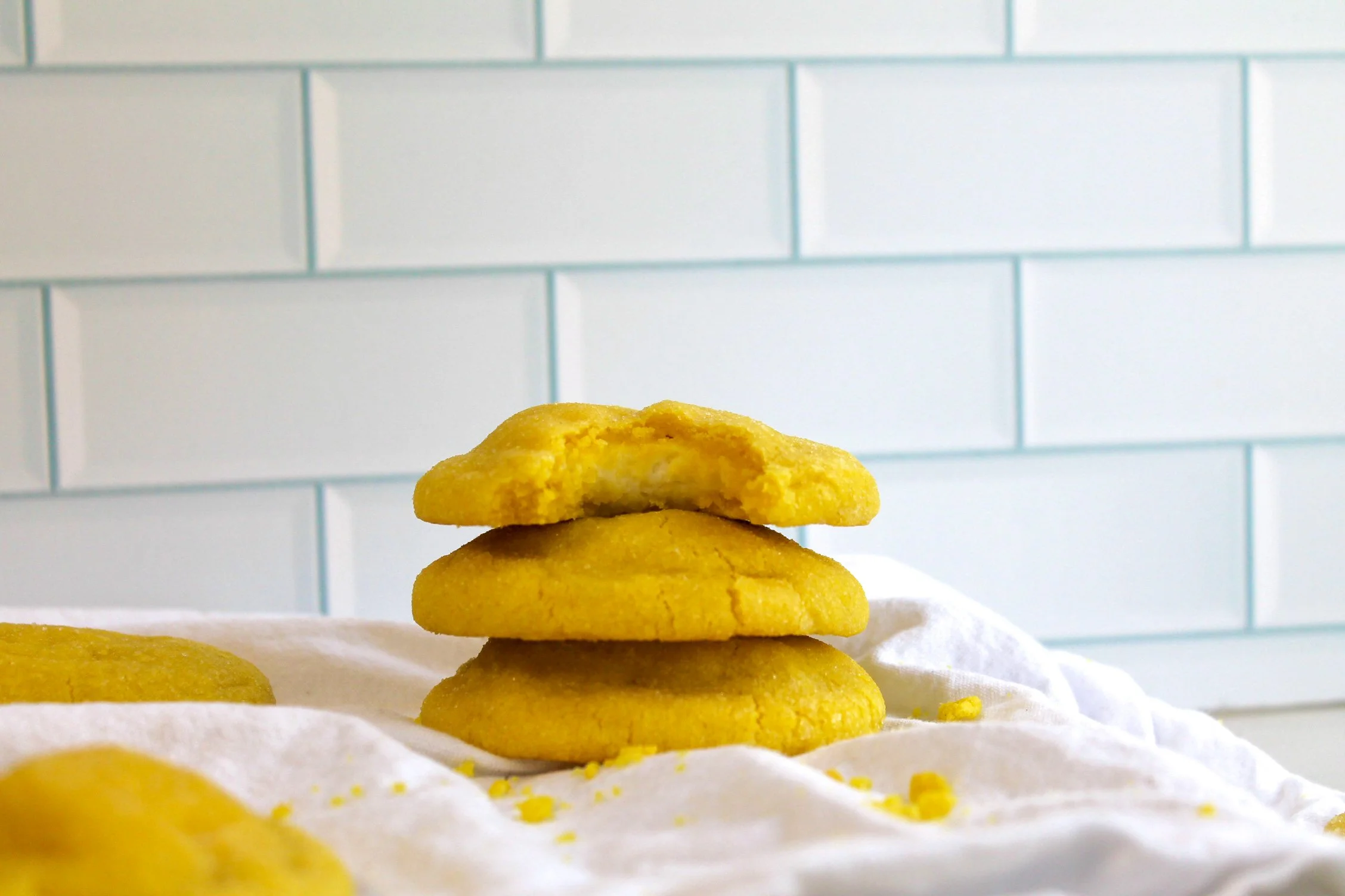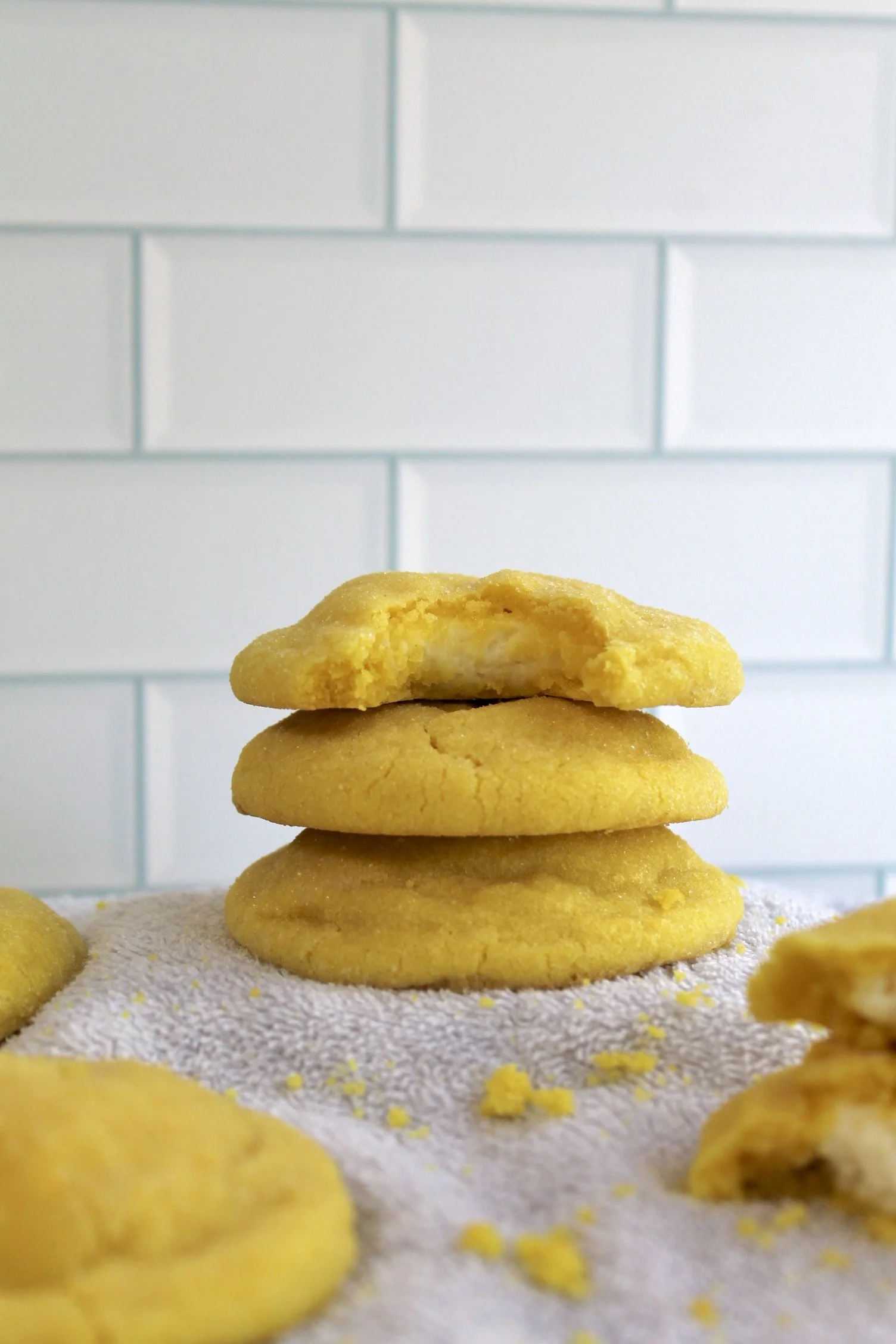 Scoop 1/3 cup of cookie dough, flatten out in palm, and add chilled cream cheese ball in the center. Fold cookie dough around the cream cheese ball and then roll in granulated sugar.