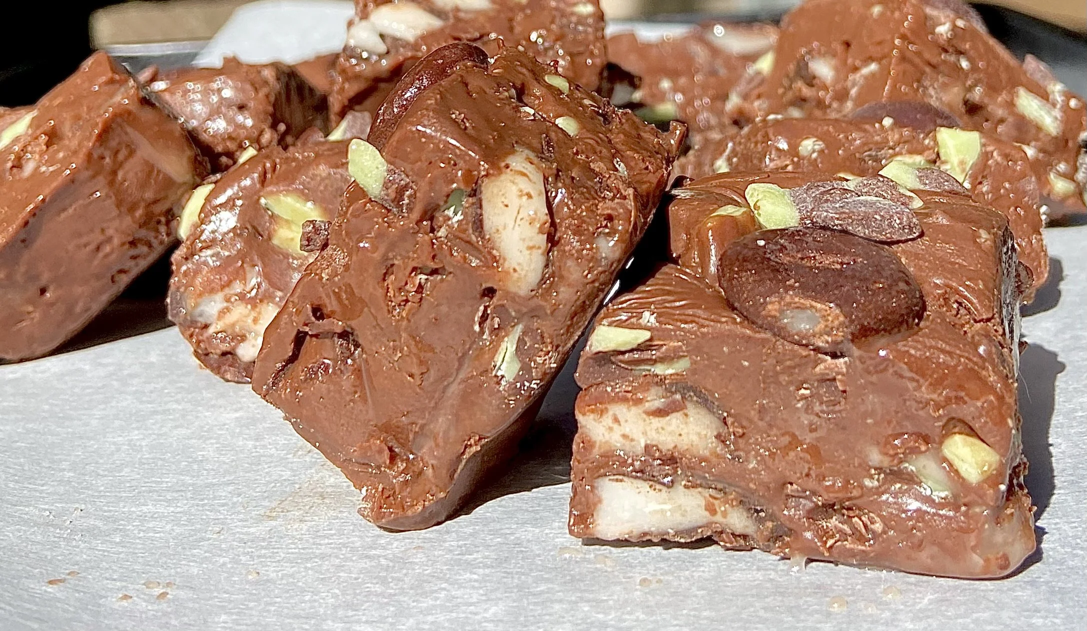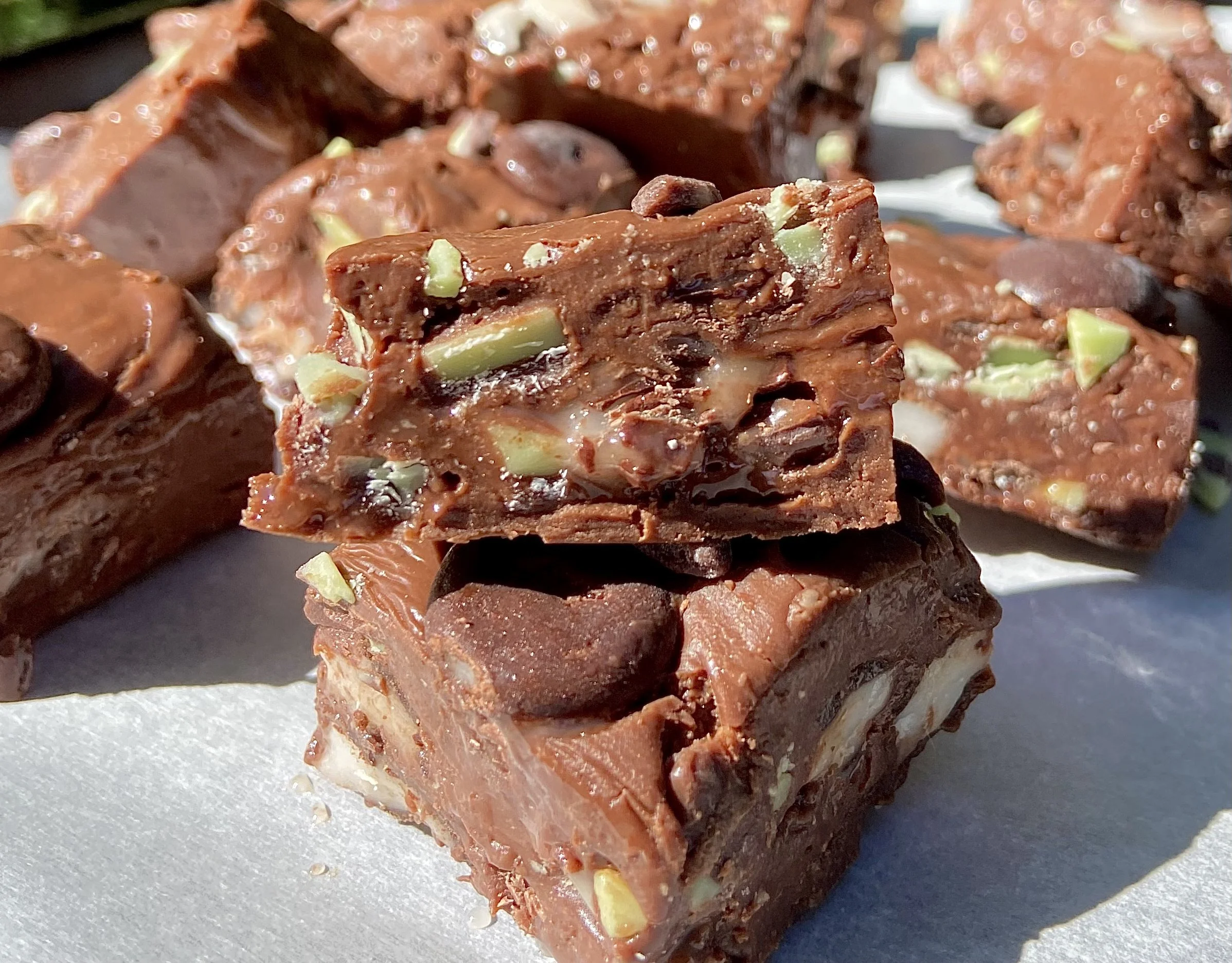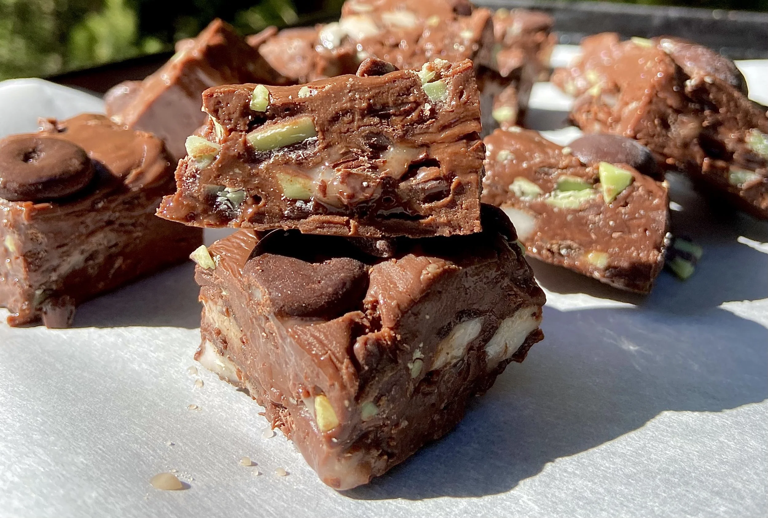 Once fudge is cooled well, cut 4x4 with (preferably) a stainless-steel knife, into 16 individual bars.