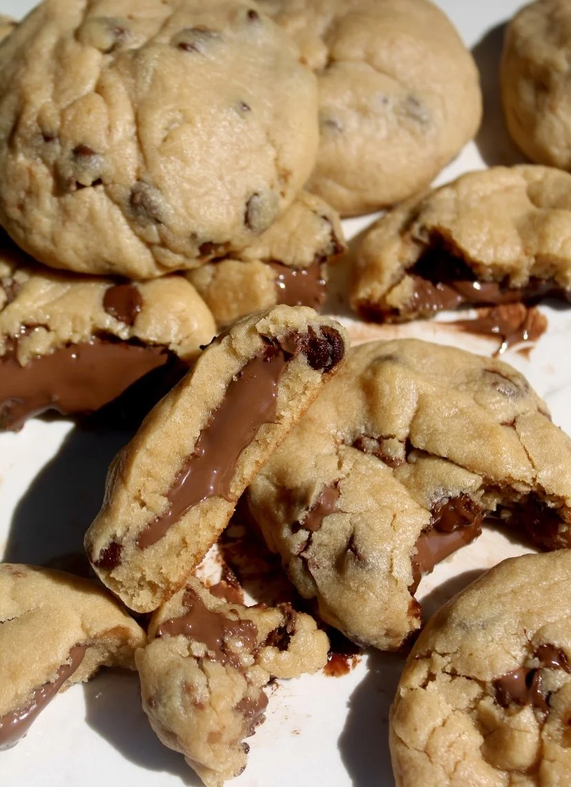 Scoop 1/3 cup scoops of cookie dough and flatten out in your palm. Add 1 chilled ball of Nutella in the center and fold dough around until Nutella is secured in the center. (Repeat for the rest of your cookie dough.