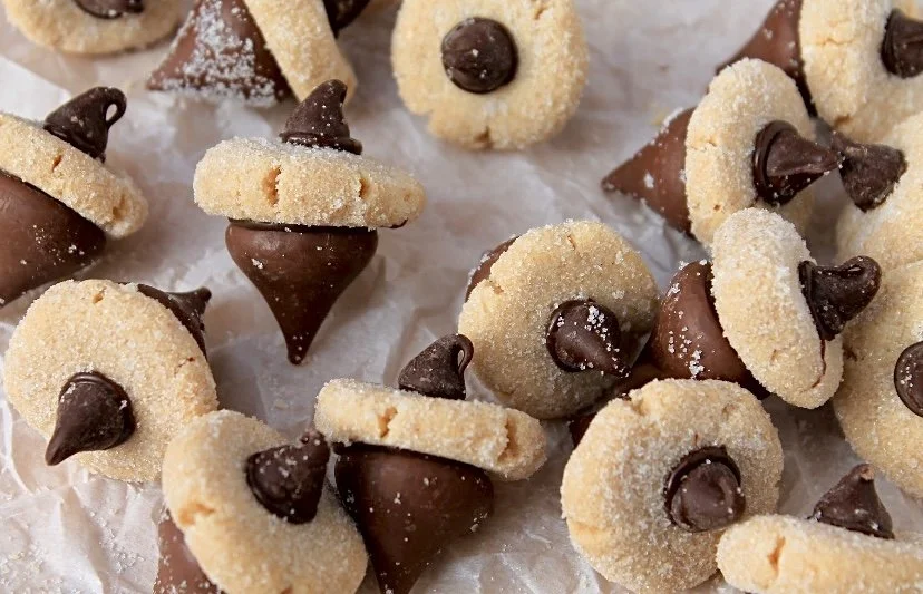 Remove cookies from fridge and flip them upside-down. Pipe a dollop of melting chocolate on the under-side of your cookies. Smoosh a Hershey kiss on top. Repeat for all cookies.