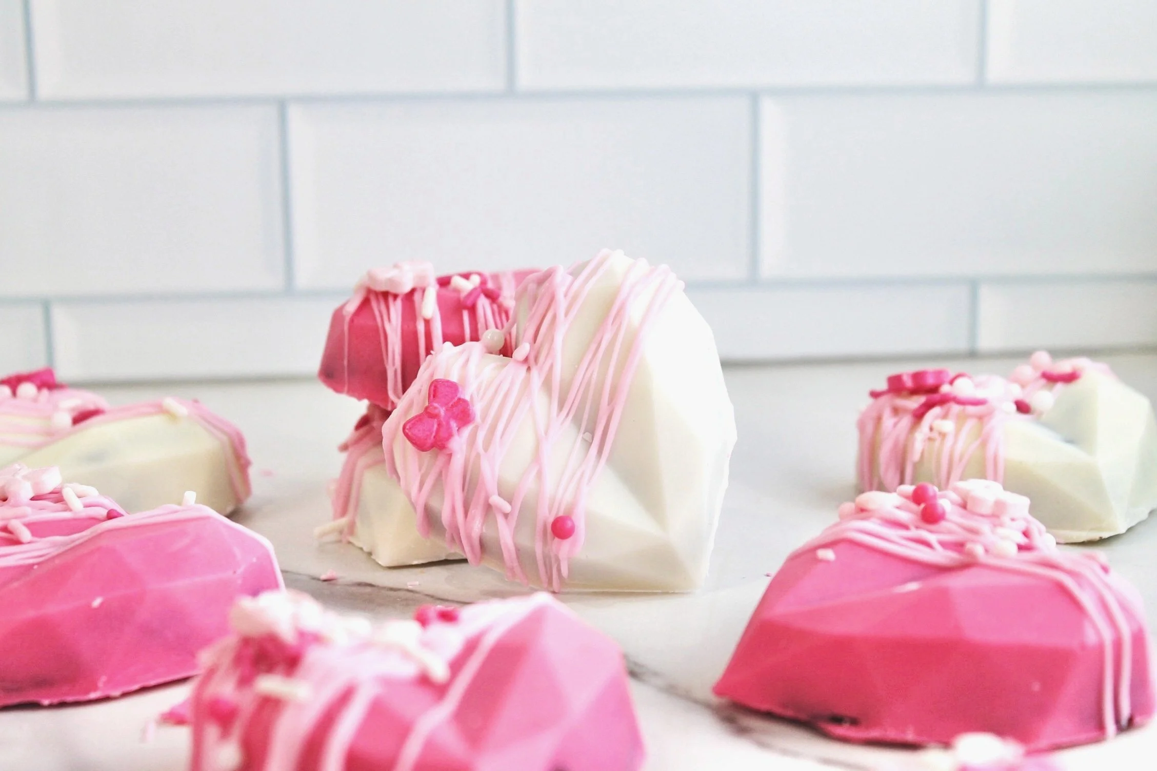 Heat up white chocolate in a microwaveable safe bowl/cup in 30-second intervals until fully melted. (If you want to dye the chocolate pink, add vegetable oil to the chocolate to thin it out.)