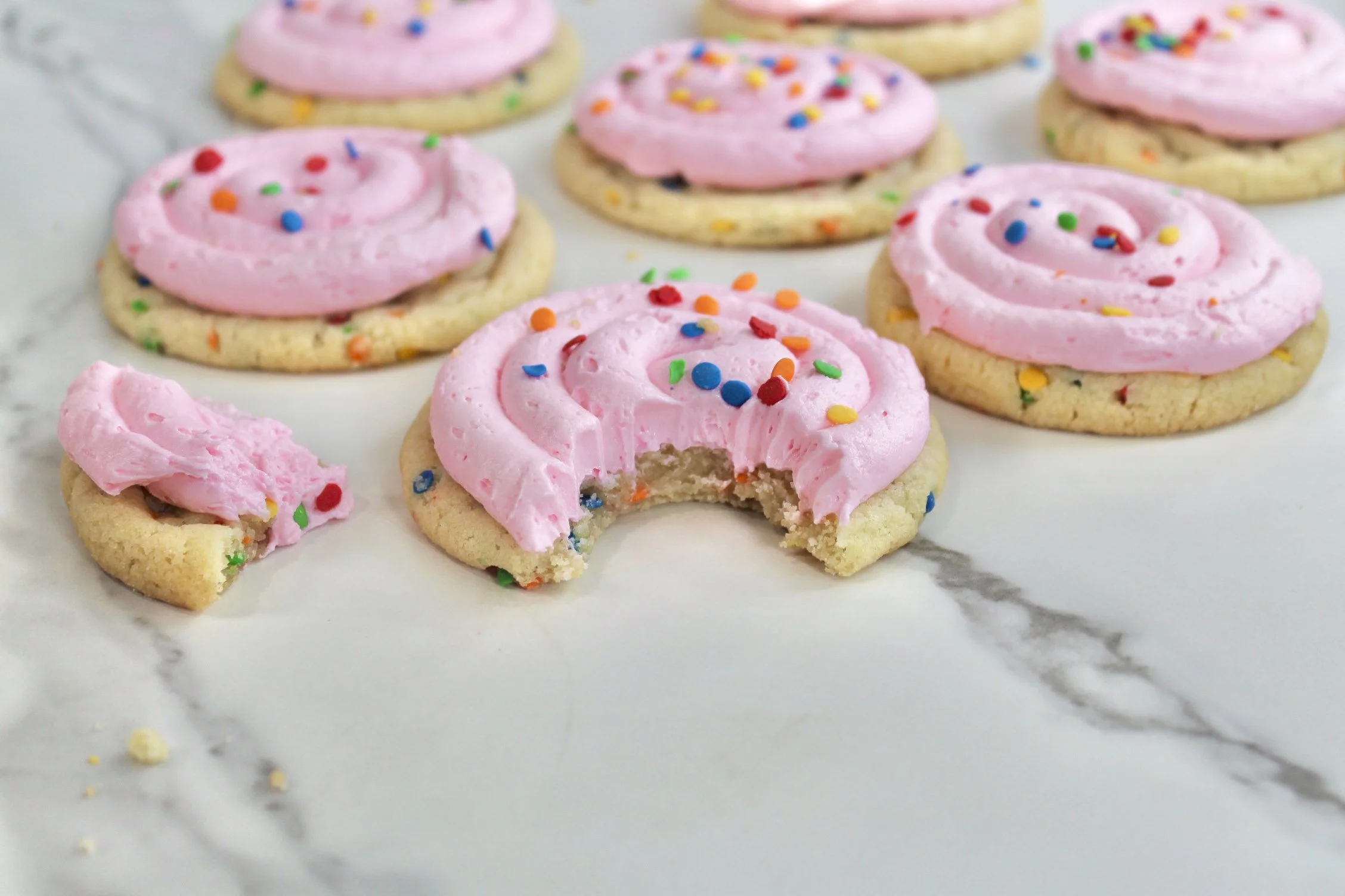 Lastly, frost your cookies in a swirl design. Repeat for each one. (I also added extra confetti sprinkles on top!)