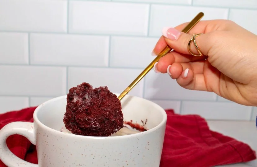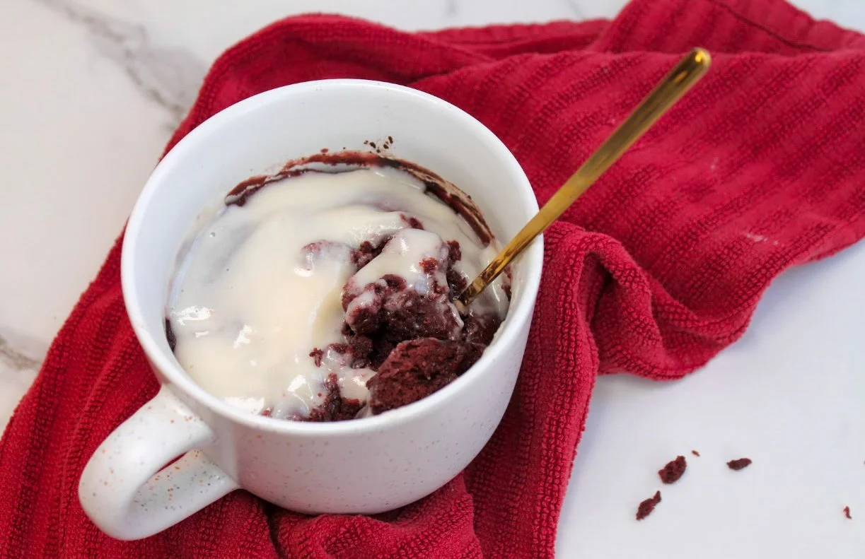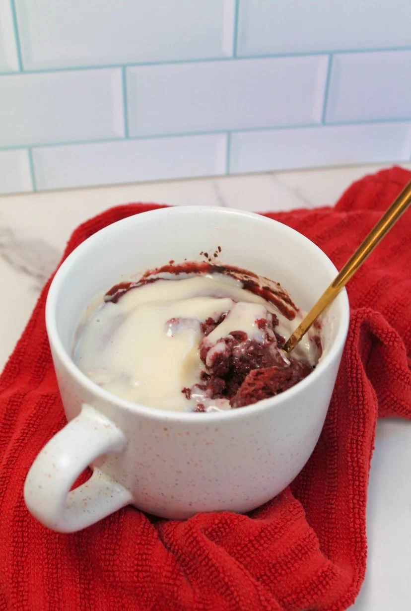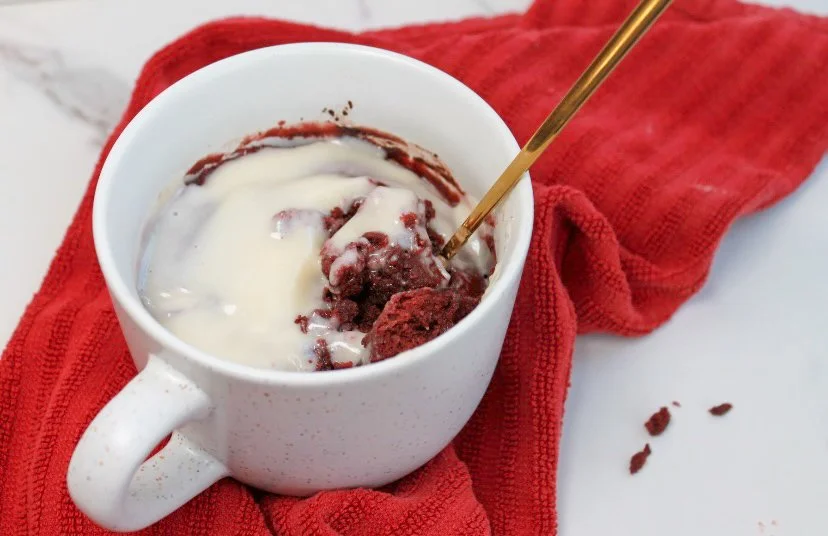 Add butter, milk, egg whites, sugar, and red food coloring in your mug, and mix until combined.
