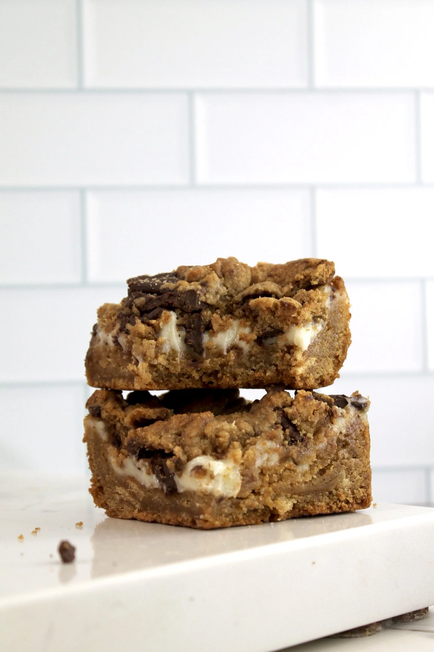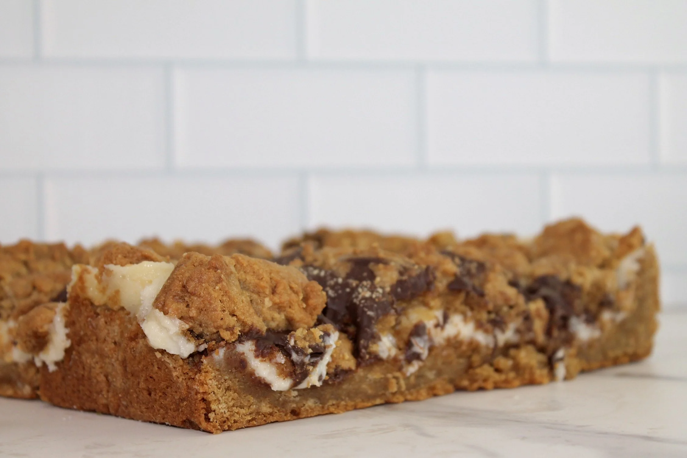 Spread out marshmallow cream cheese mixture on top of this and then mix in chocolate chunks/chips to the rest of cookie dough and place on top in chunks.