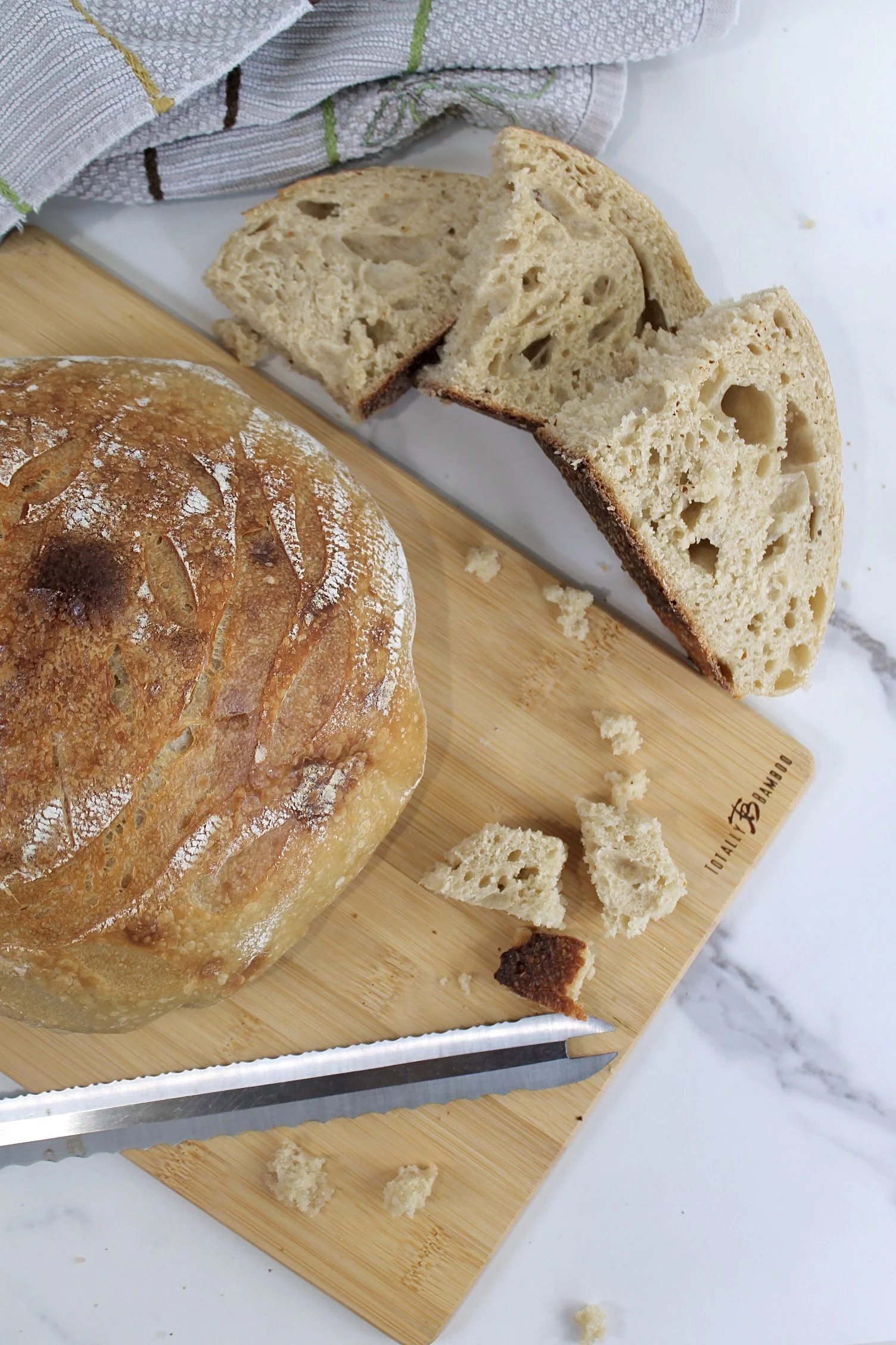 Let the loaf sit and come to room temperature for about an hour before cutting and eating fresh (repeat for other loaf)!