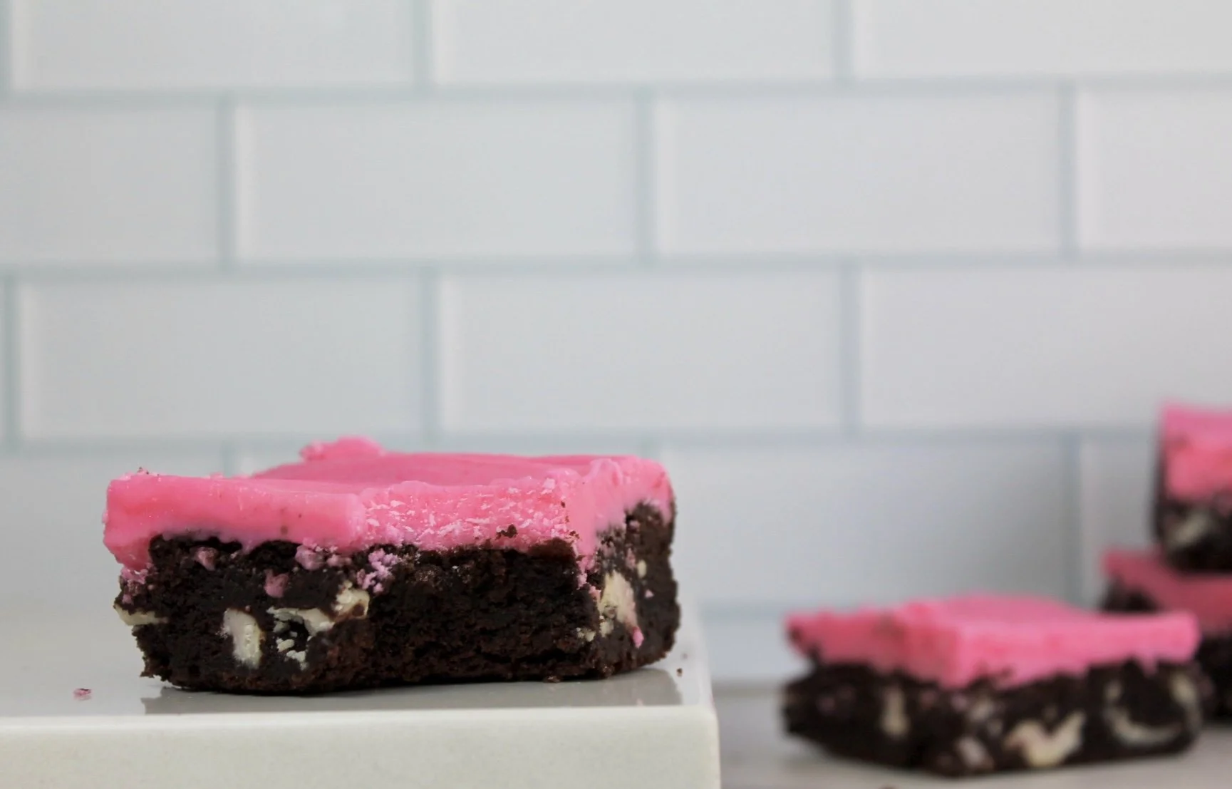 Chop up strawberries and cream chocolates and add to brownie batter.