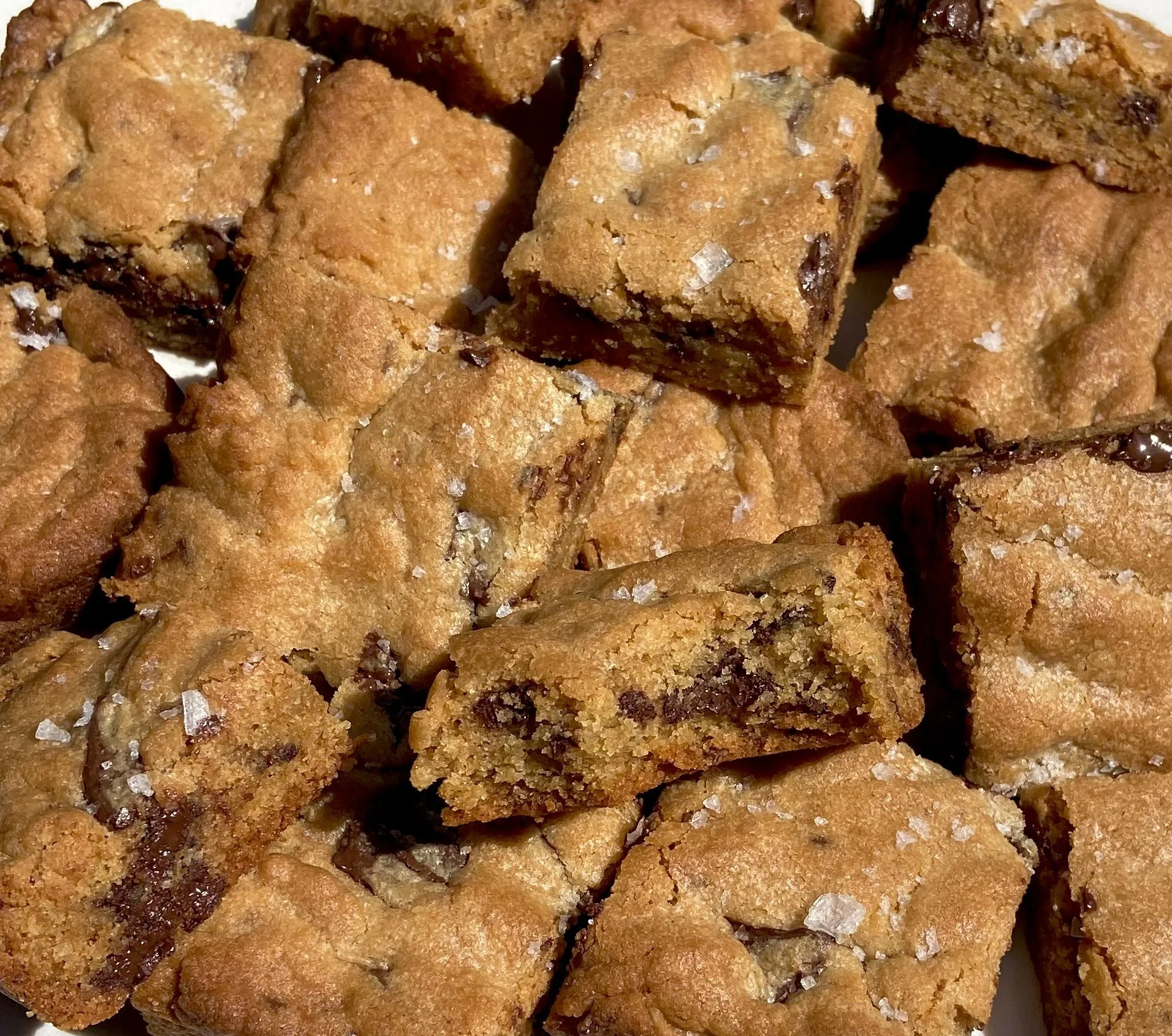 Step 6- Remove the blondie from the pan before cutting with a large knife. (Make sure to wipe the knife before cutting again to get perfect blondies!)
